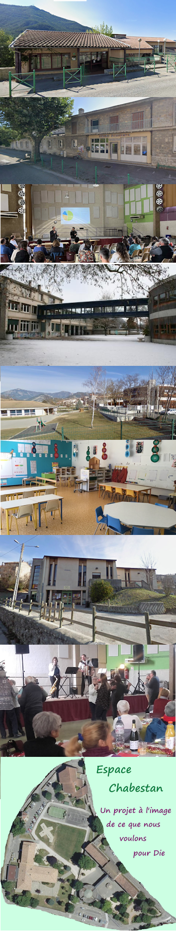 Idéalement situé entre le centre historique, la Drôme, les jardins du Perrier, la forêt et bénéficiant d’un grand parc, les écoles et la salle polyvalente doivent rester sur ce lieu proche de la ville, pour bénéficier de cet environnement privilégié pour apprendre et grandir. Mais l’ensemble de l’Espace Chabestan, doit être repensé pour mieux accueillir les publics, s’adapter à l’évolution du climat et aux nouveaux usages.